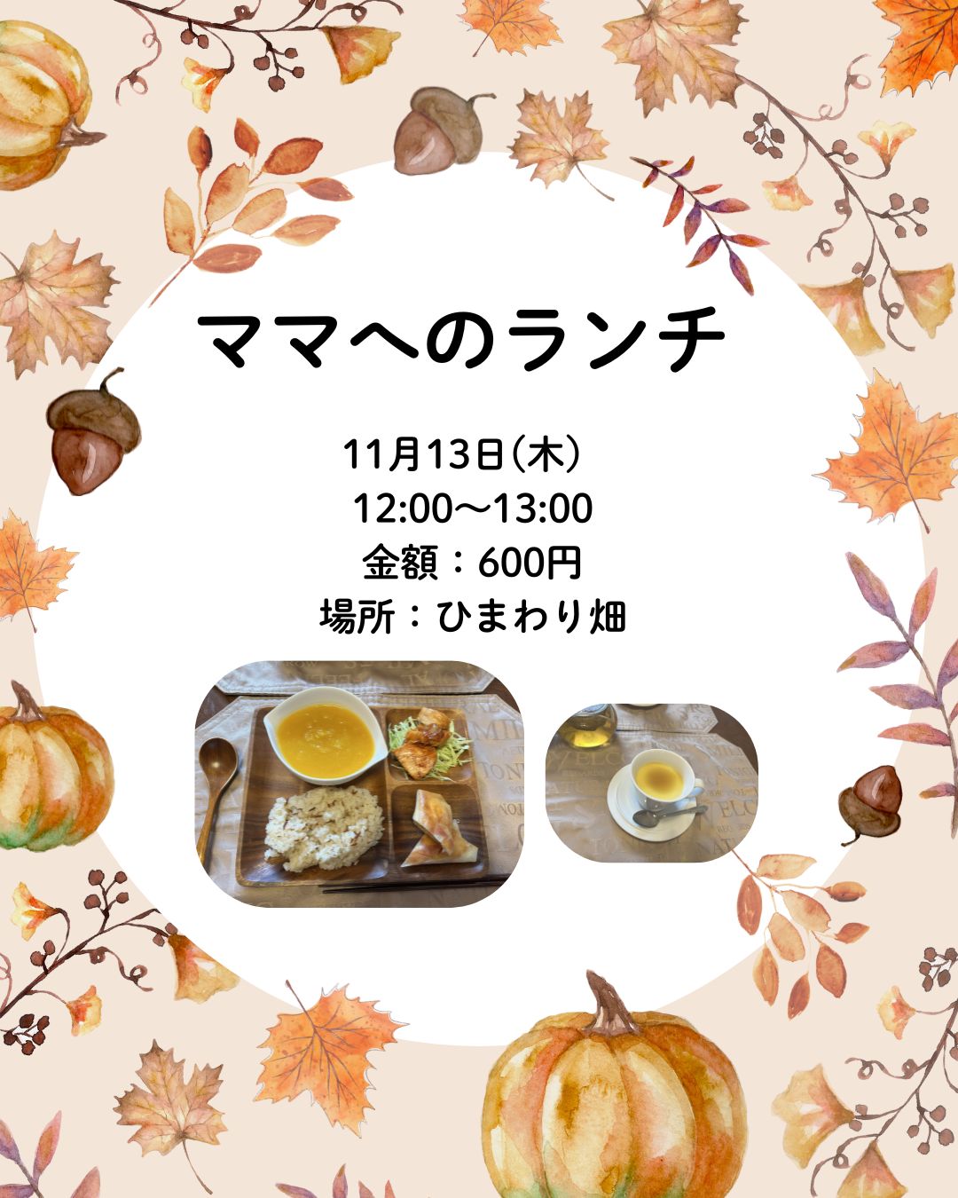 11月13日(木)ママへのランチ 美味しいお料理を囲みながらゆっくりと 楽しいひとときを一緒に過ごしましょう。 もちろんお子さま連れで! 日:10月21日(火)(募集中) 時:12:00~13:00 場所:ひまわり畑 お値段:600円 予約:5人まで(ひまわり畑) (写真は10月のランチです)