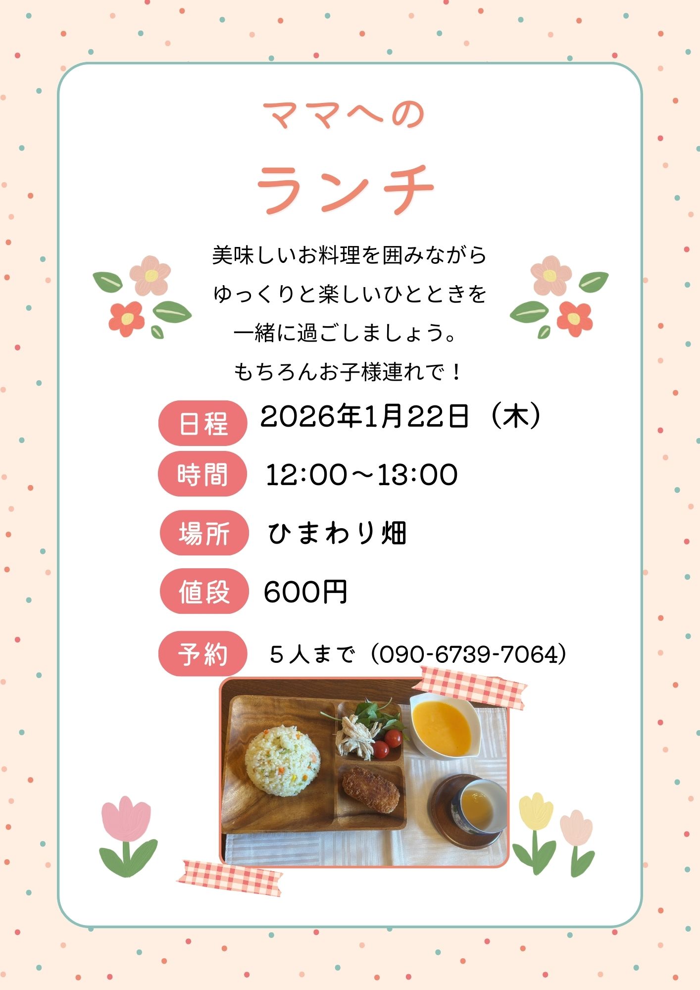 1月22日(木)ママへのランチ 美味しいお料理を囲みながらゆっくりと 楽しいひとときを一緒に過ごしましょう。 もちろんお子さま連れで! 時:12:00~13:00 場所:ひまわり畑 お値段:600円 予約:5人まで(ひまわり畑) (写真は過去のランチです。 毎回シェフのお任せ))
